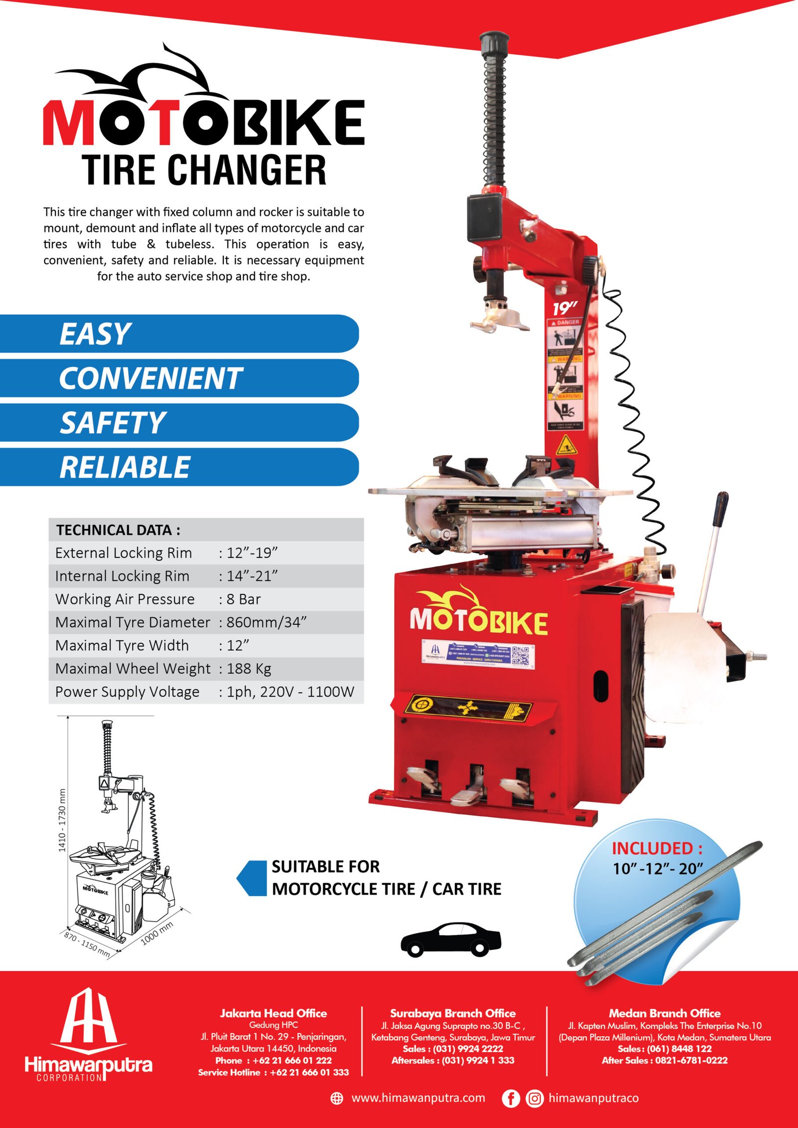 This tire changer with fixed column and rocker is suitable to mount, demount and inflate all types of motorcycle and car tires with tube & tubeless. This operation is easy, convenient, safety, and reliable. It is necessary equipment for the auto service shop and tire shop.